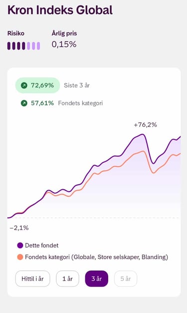 Deres globale indeksfond har levert svært konkurransedyktig avkastning – på nivå med, og i flere tilfeller bedre enn, de mest populære alternativene hos andre aktører. Selv om ingen kan garantere fremtidig avkastning, viser historiske tall at Kron har vært et solid valg.